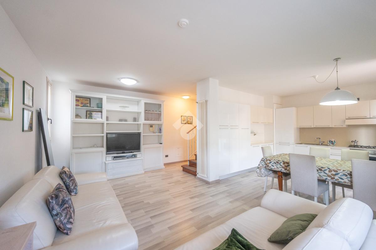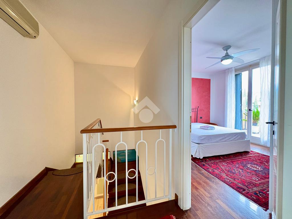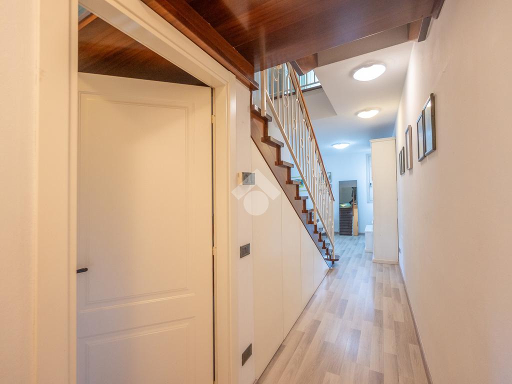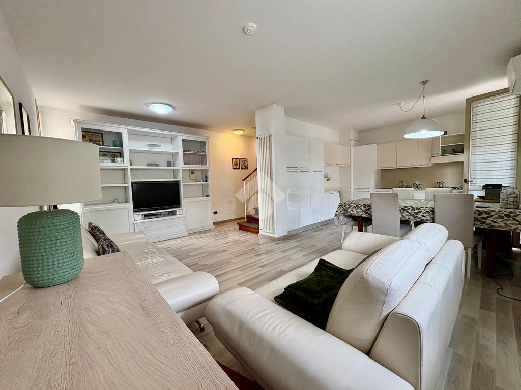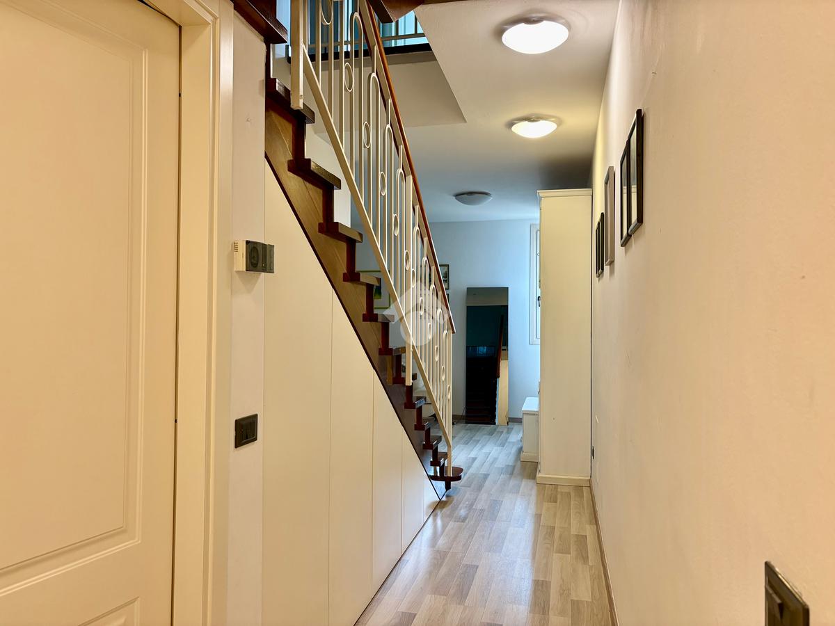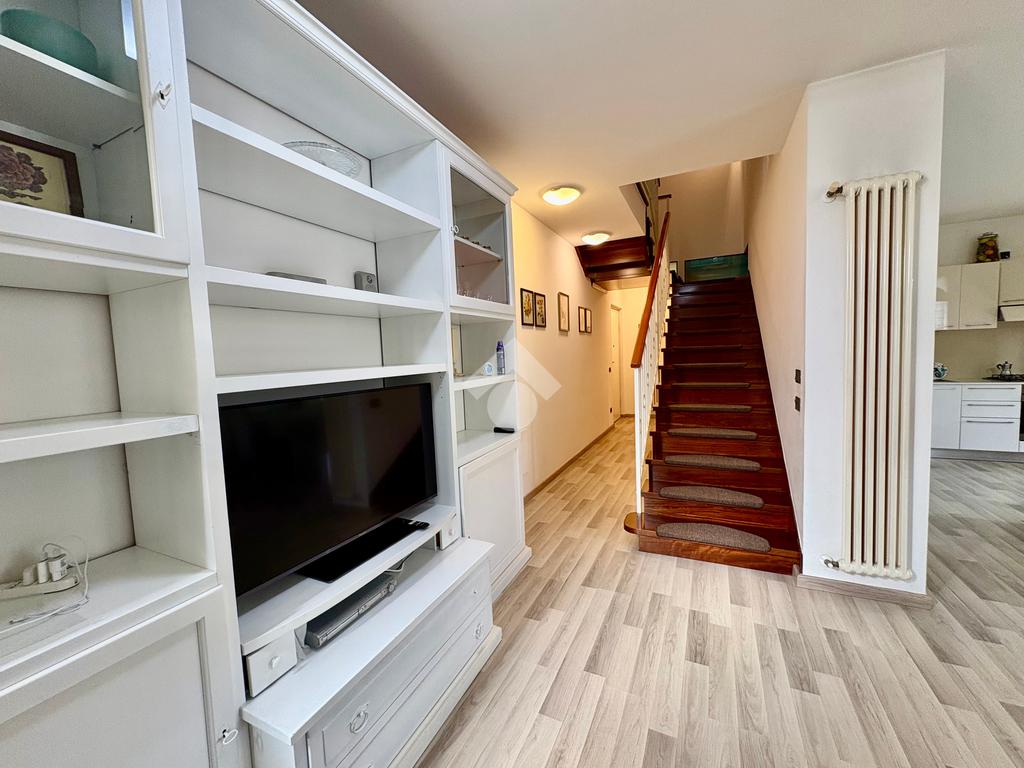 L'immobile si compone, al piano primo, di un' ampia zona giorno suddivisa in angolo cottura, pranzo e luminosa zona living con accesso ad un terrazzo coperto e abitabile, un antibagno ed un bagno con doccia finestrato. A mezzo di una scala in legno accediamo alla zona notte posta al piano secondo, dove troviamo due camere matrimoniali, una delle quali servita da un secondo terrazzo, ed un bagno con vasca finestrato. L' abitazione è dotata di impianto di condizionamento in tutti i locali, recentemente installato. Al piano seminterrato l'immobile dispone di un' ampia cantina e di una comoda autorimessa. All'esterno, la proprietà condominiale mette a disposizione un parcheggio comune.