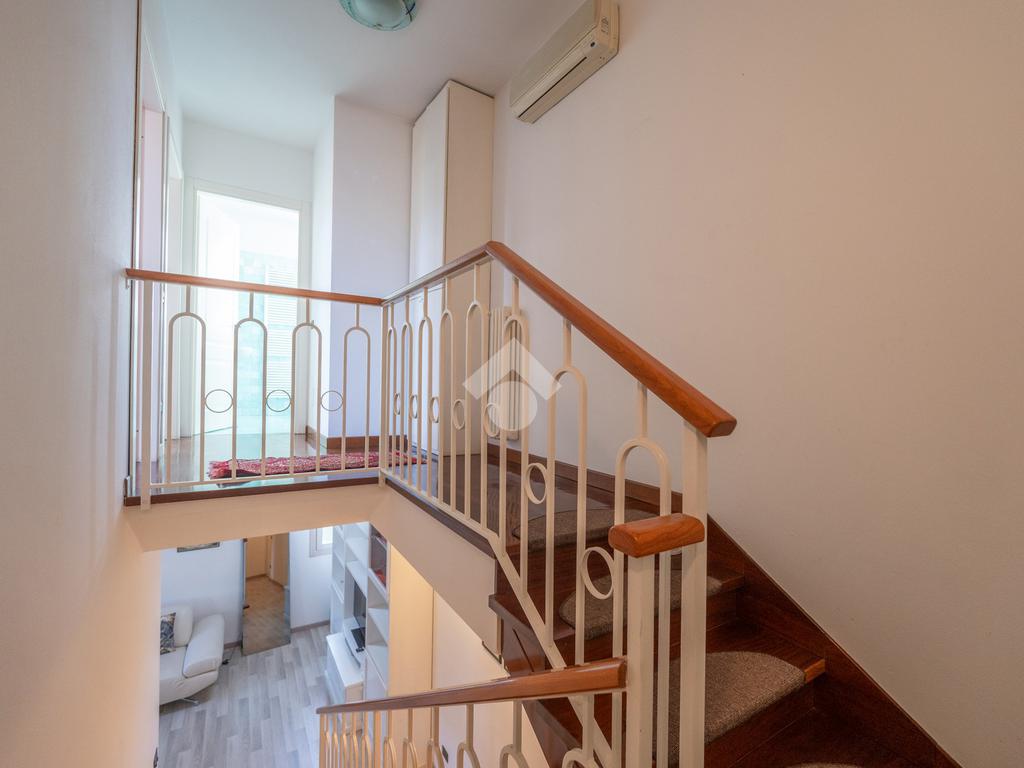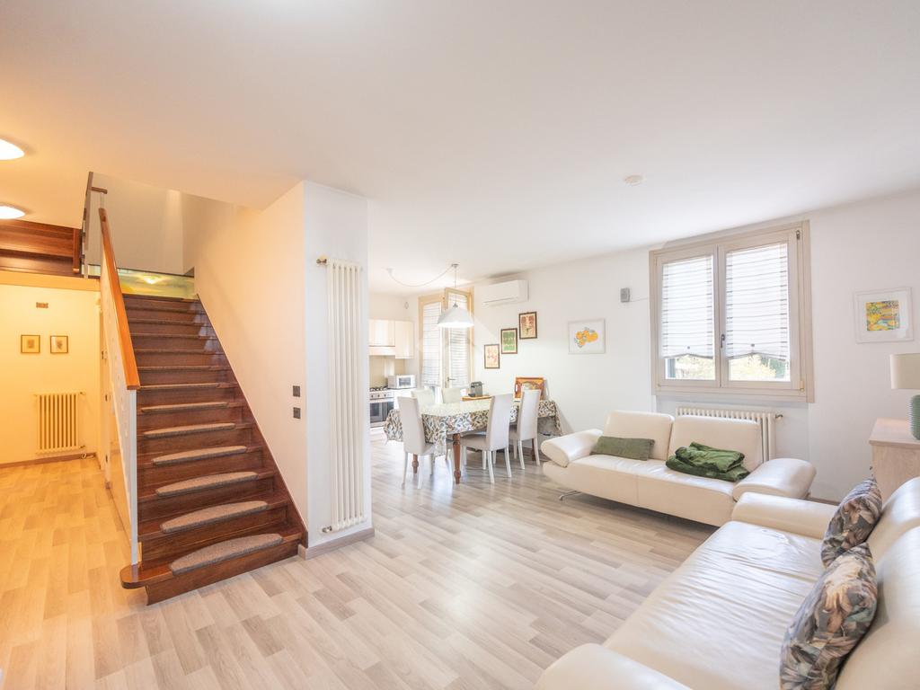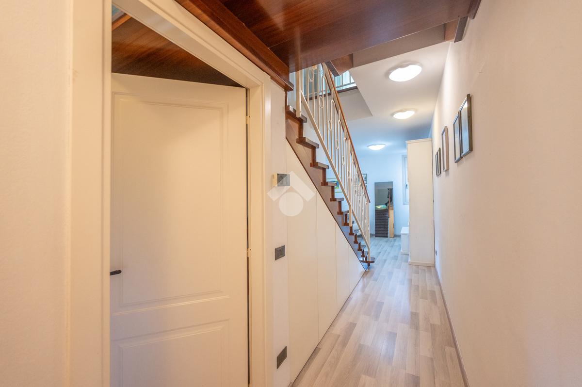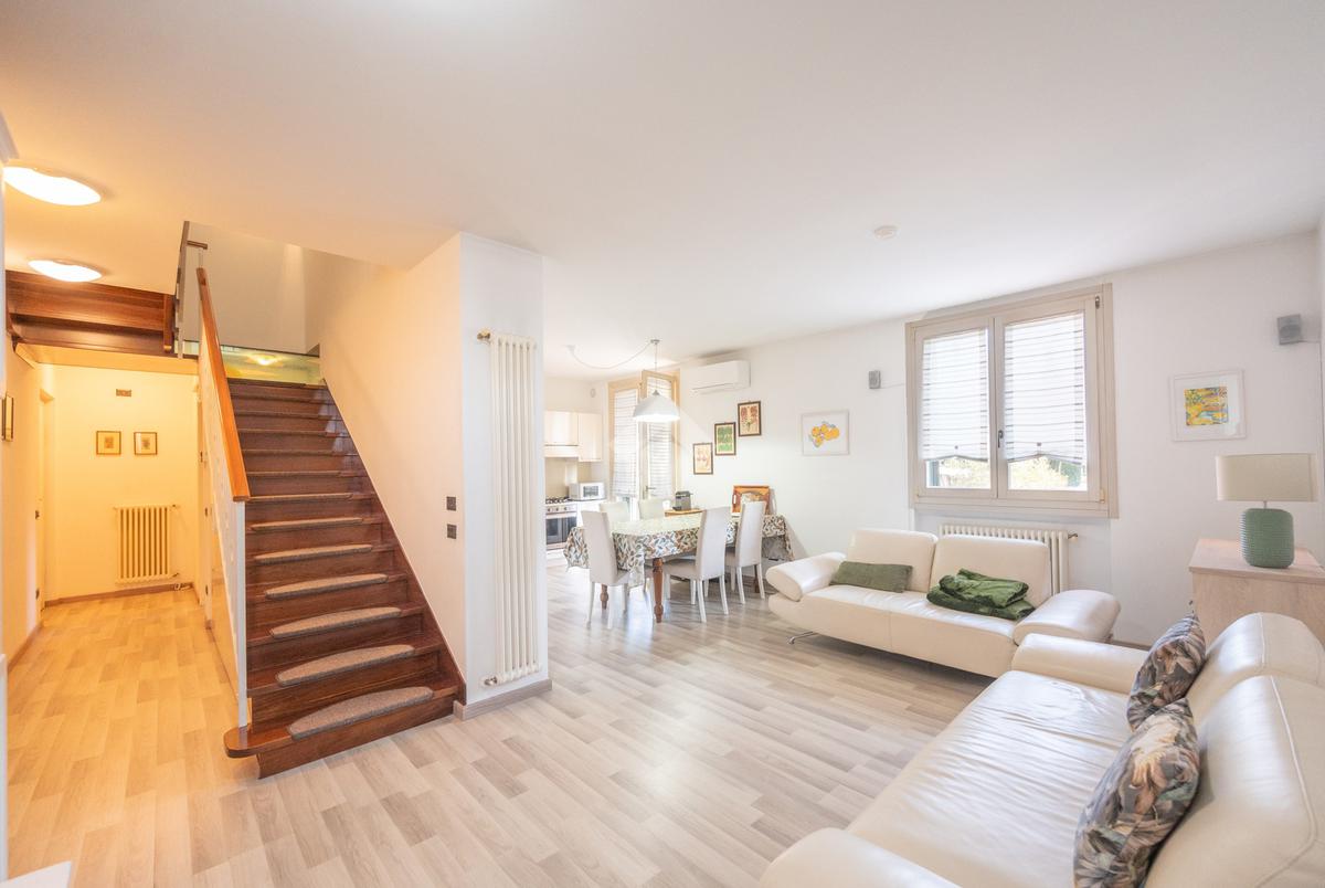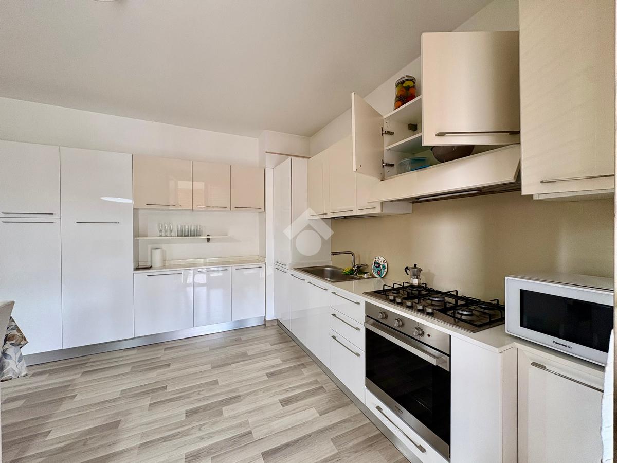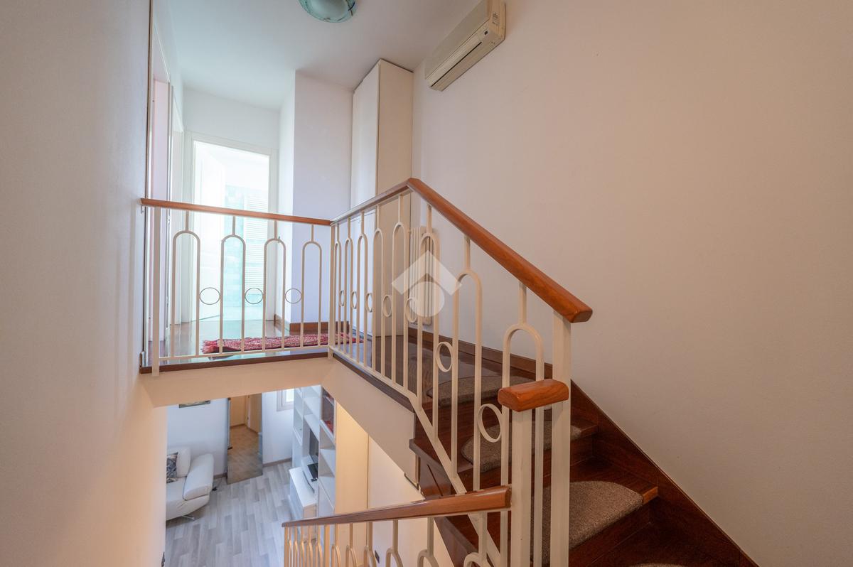 L'immobile si compone, al piano primo, di un' ampia zona giorno suddivisa in angolo cottura, pranzo e luminosa zona living con accesso ad un terrazzo coperto e abitabile, un antibagno ed un bagno con doccia finestrato. A mezzo di una scala in legno accediamo alla zona notte posta al piano secondo, dove troviamo due camere matrimoniali, una delle quali servita da un secondo terrazzo, ed un bagno con vasca finestrato. L' abitazione è dotata di impianto di condizionamento in tutti i locali, recentemente installato. Al piano seminterrato l'immobile dispone di un' ampia cantina e di una comoda autorimessa. All'esterno, la proprietà condominiale mette a disposizione un parcheggio comune.