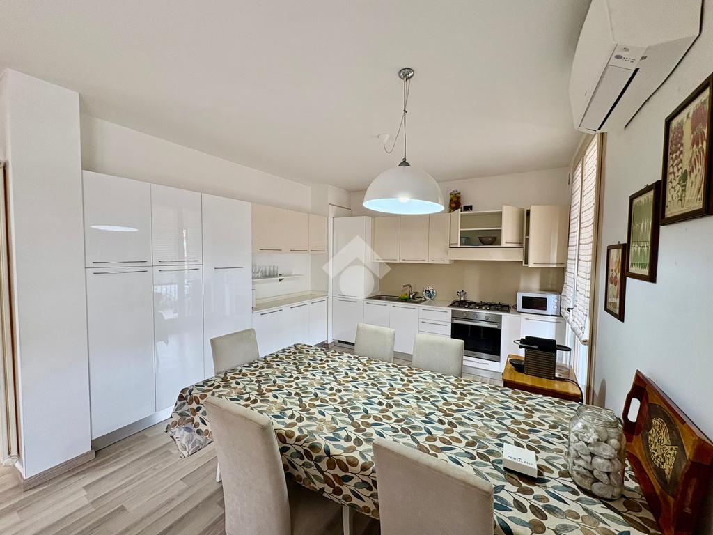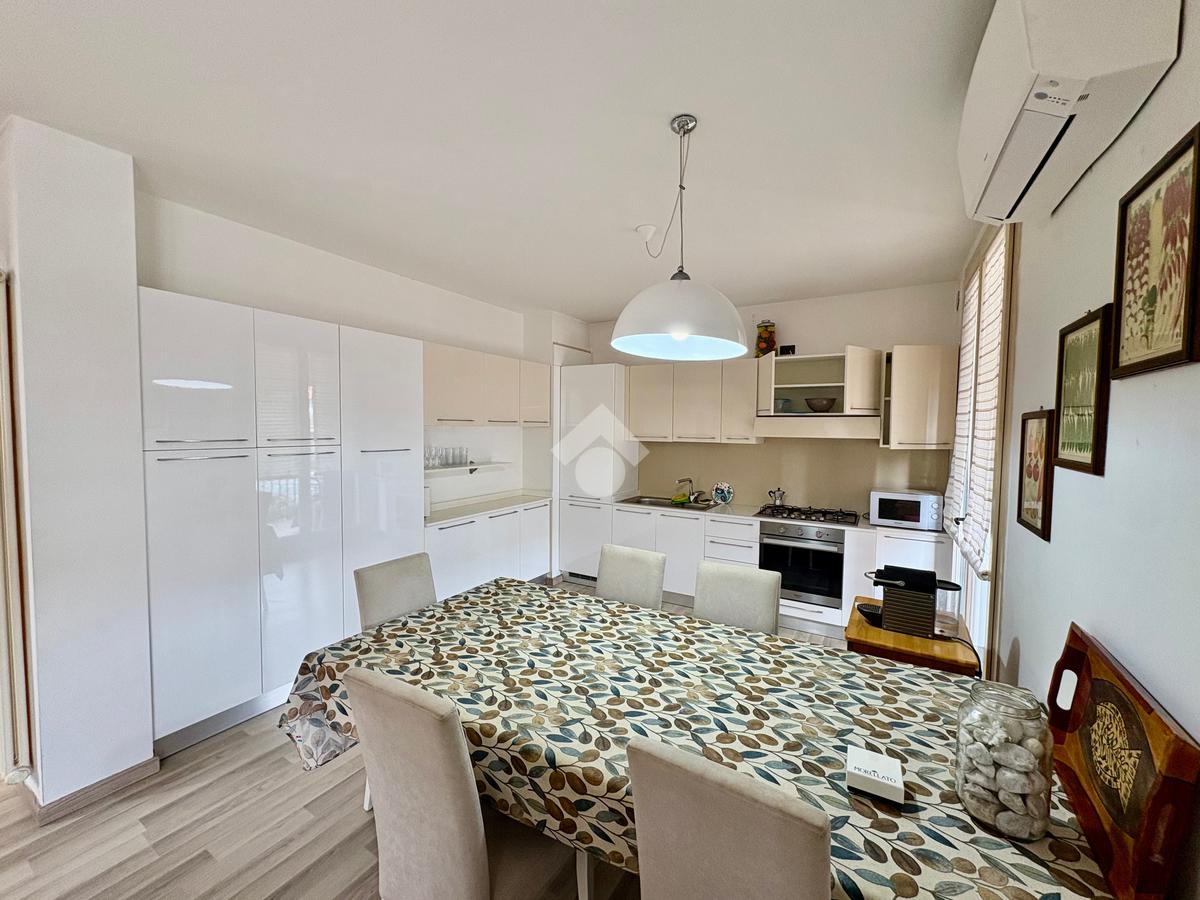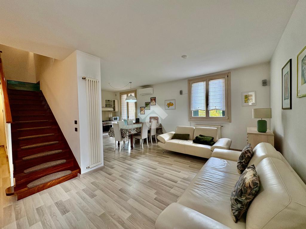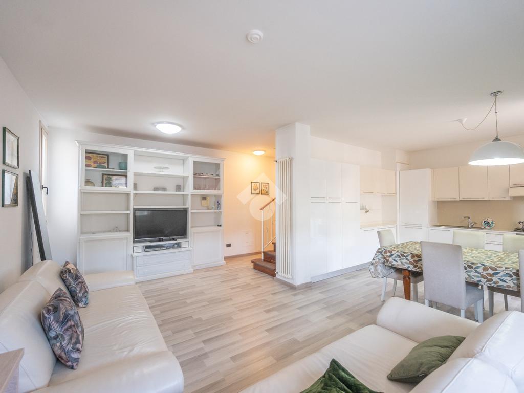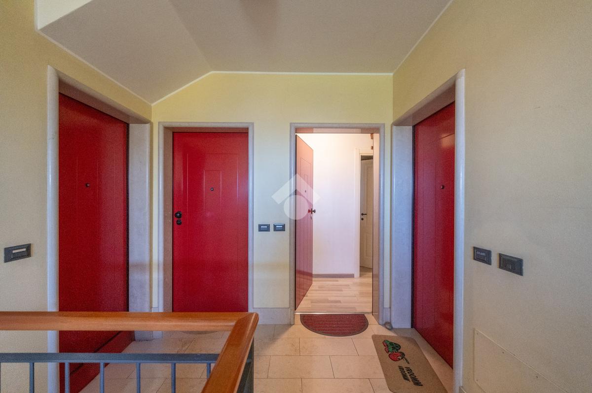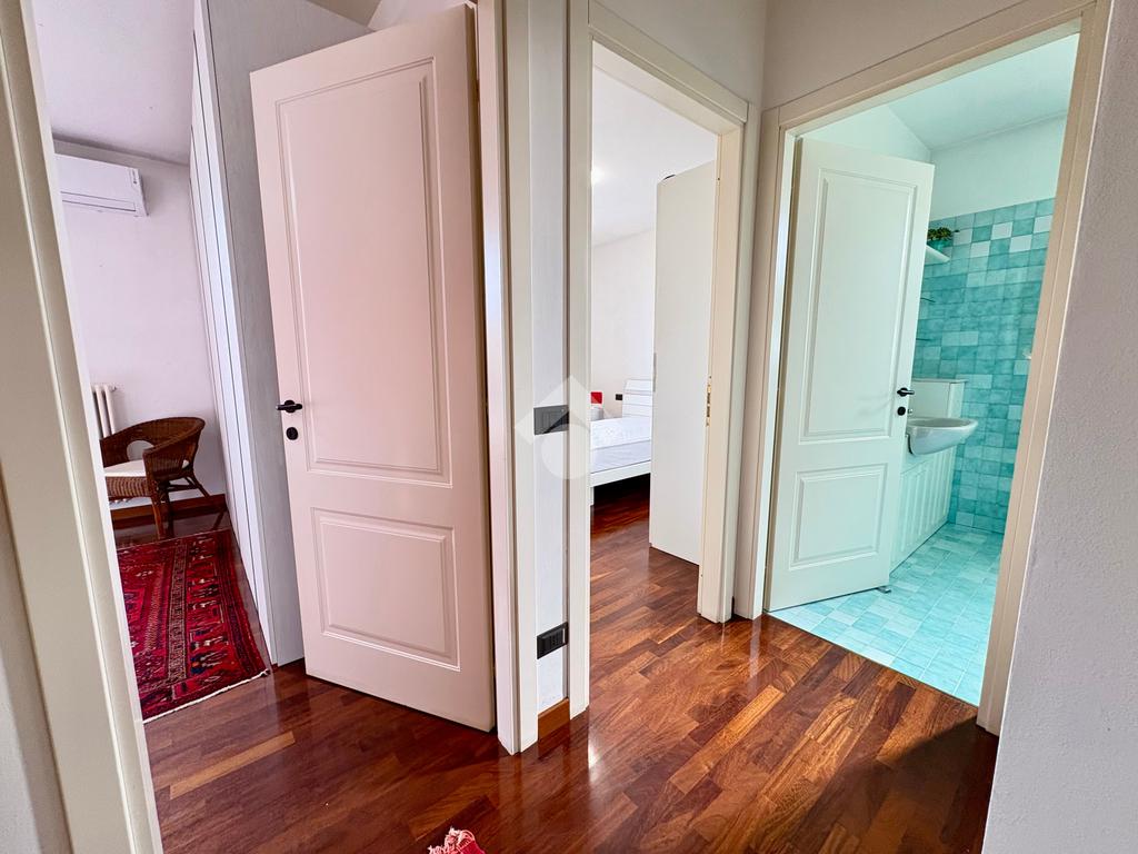 L'immobile si compone, al piano primo, di un' ampia zona giorno suddivisa in angolo cottura, pranzo e luminosa zona living con accesso ad un terrazzo coperto e abitabile, un antibagno ed un bagno con doccia finestrato. A mezzo di una scala in legno accediamo alla zona notte posta al piano secondo, dove troviamo due camere matrimoniali, una delle quali servita da un secondo terrazzo, ed un bagno con vasca finestrato. L' abitazione è dotata di impianto di condizionamento in tutti i locali, recentemente installato. Al piano seminterrato l'immobile dispone di un' ampia cantina e di una comoda autorimessa. All'esterno, la proprietà condominiale mette a disposizione un parcheggio comune.