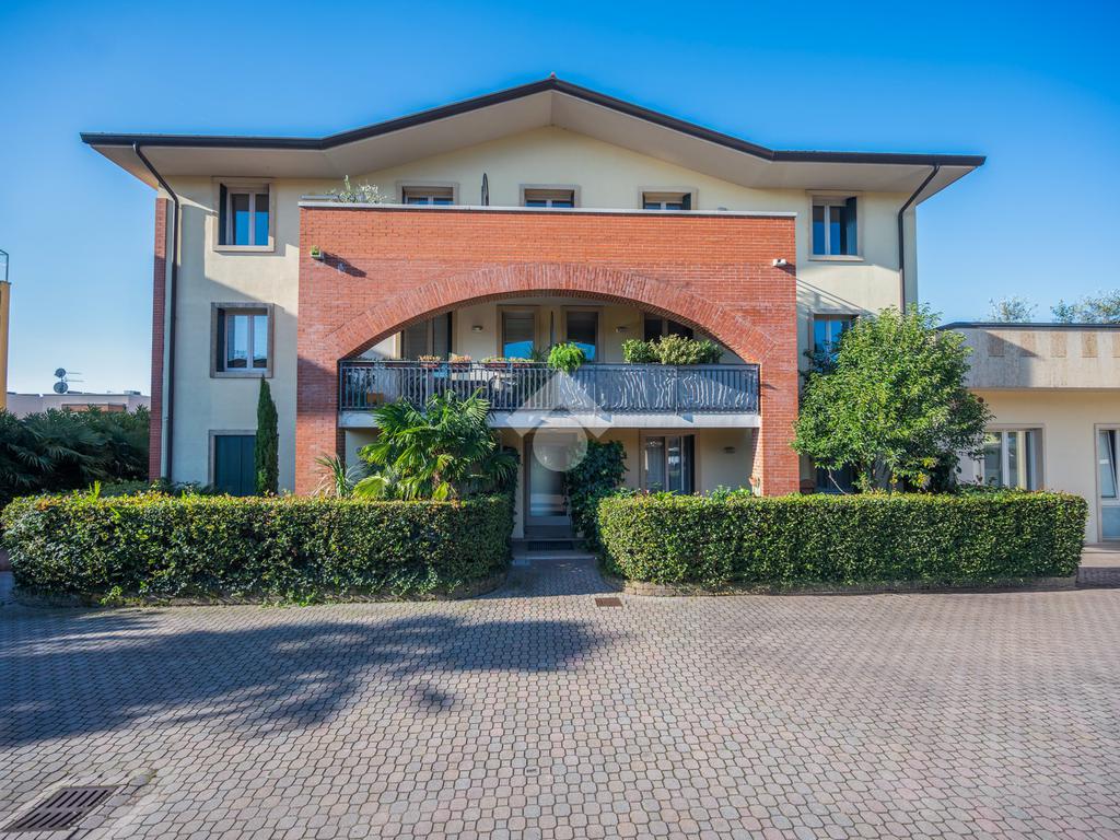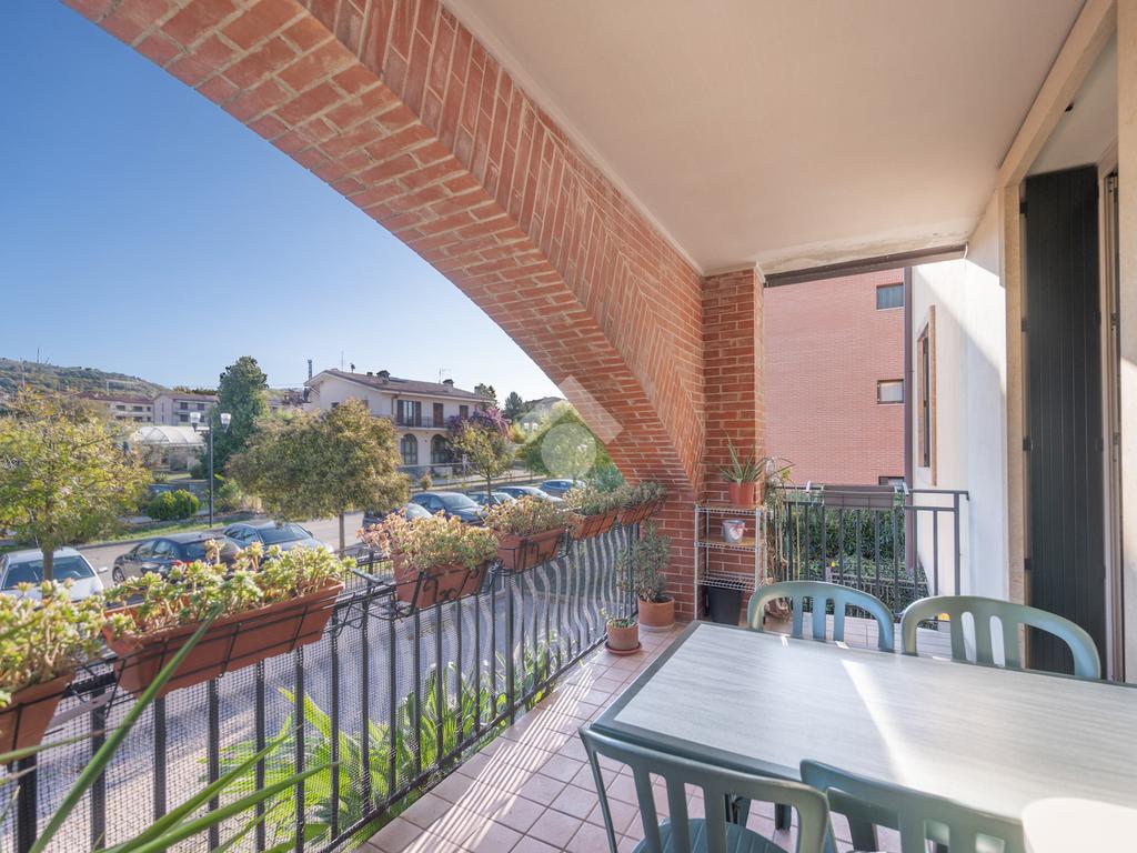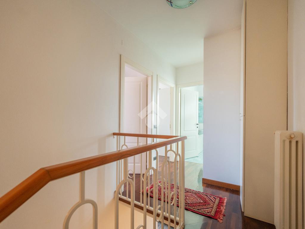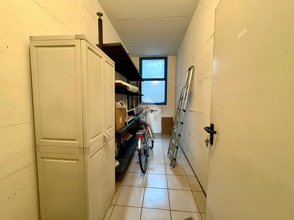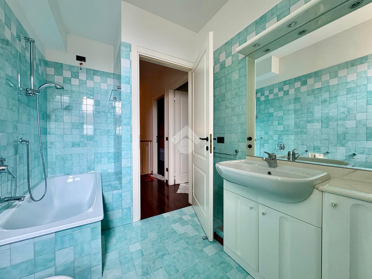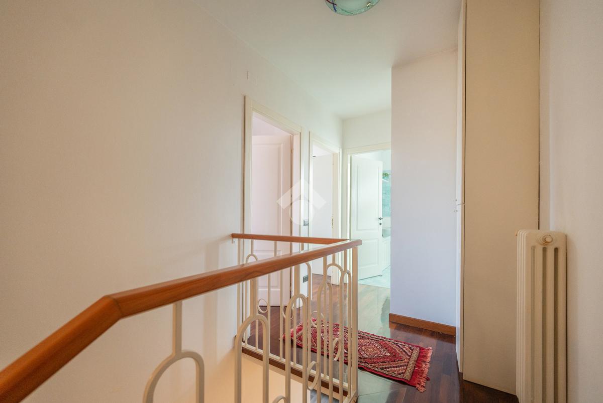 L'immobile si compone, al piano primo, di un' ampia zona giorno suddivisa in angolo cottura, pranzo e luminosa zona living con accesso ad un terrazzo coperto e abitabile, un antibagno ed un bagno con doccia finestrato. A mezzo di una scala in legno accediamo alla zona notte posta al piano secondo, dove troviamo due camere matrimoniali, una delle quali servita da un secondo terrazzo, ed un bagno con vasca finestrato. L' abitazione è dotata di impianto di condizionamento in tutti i locali, recentemente installato. Al piano seminterrato l'immobile dispone di un' ampia cantina e di una comoda autorimessa. All'esterno, la proprietà condominiale mette a disposizione un parcheggio comune.