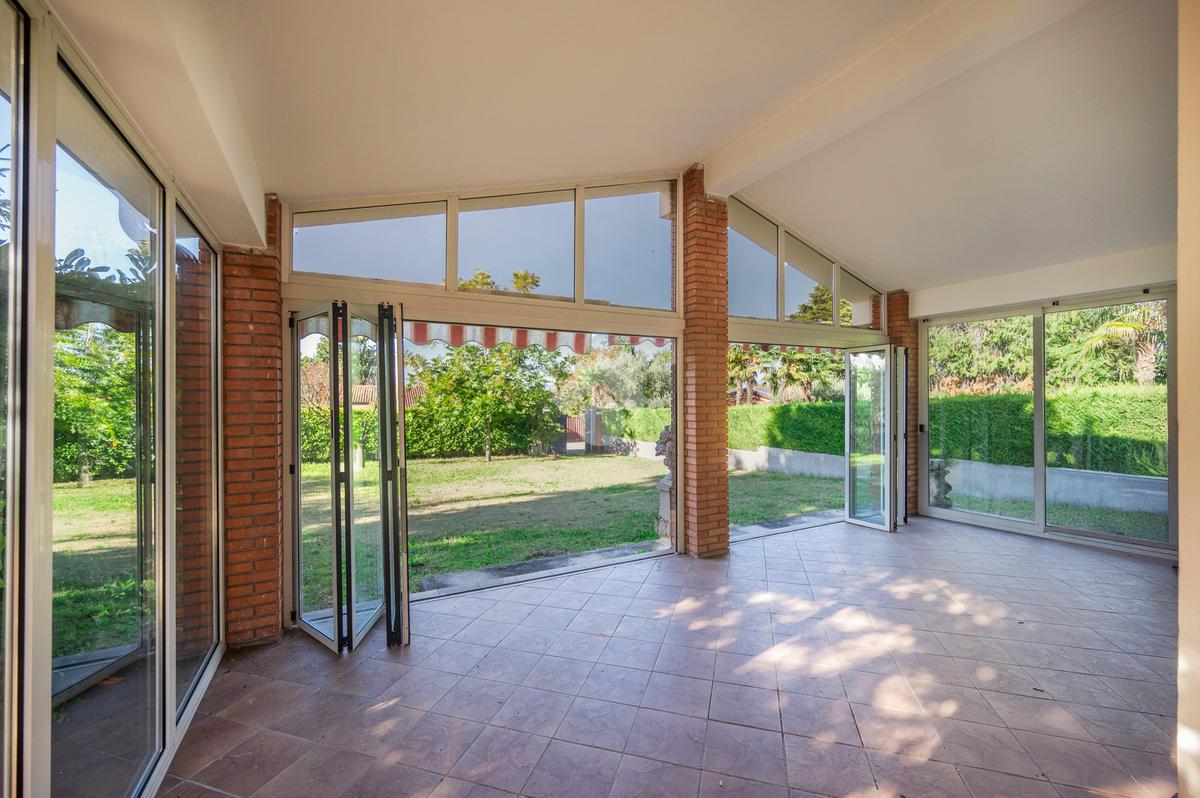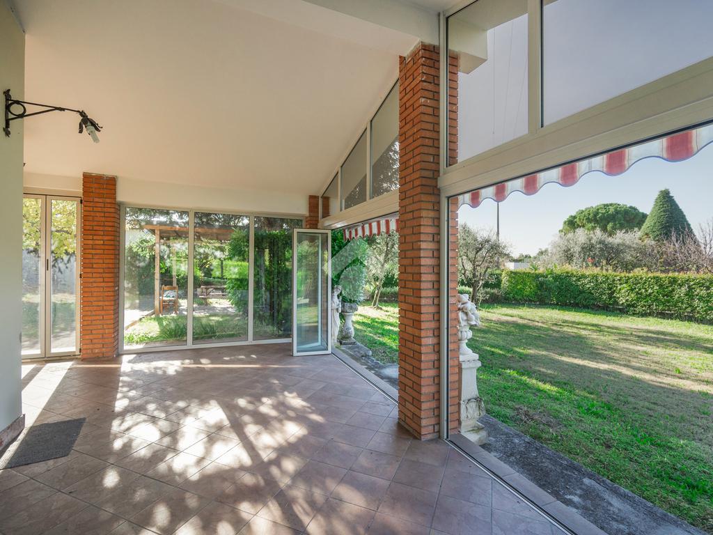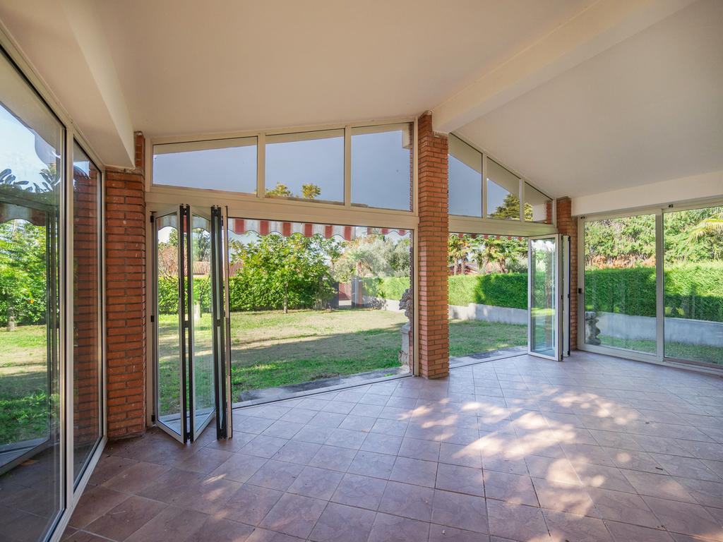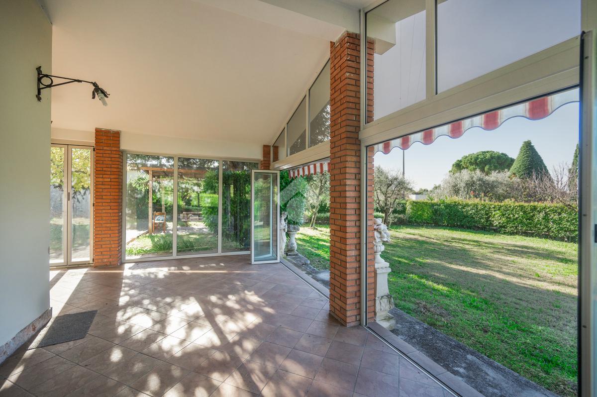 completa di arredo. All’ingresso troviamo un'ampio e luminoso porticato che costituisce un naturale prolungamento del soggiorno e consente l' accesso immediato al giardino, il soggiorno, un cucinotto finestrato, il